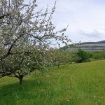- Im Vordergrund blühende Obstbäume, im Hintergrund ein Steinbruch