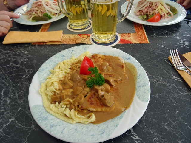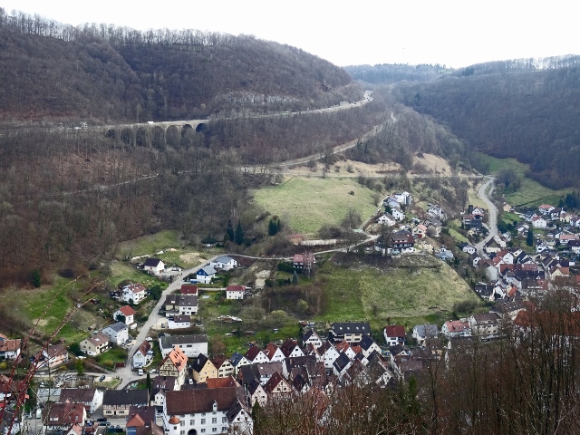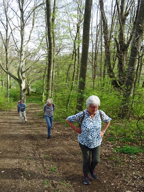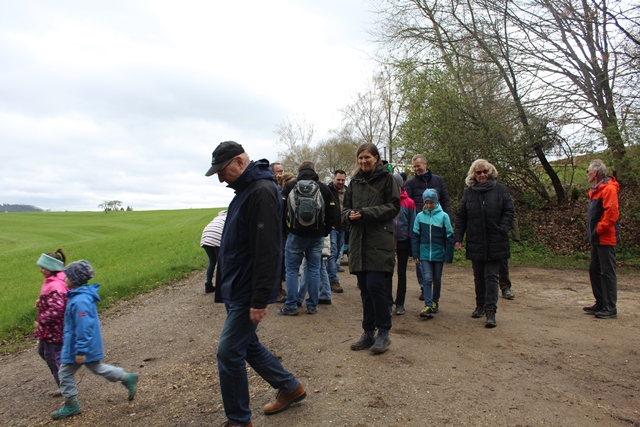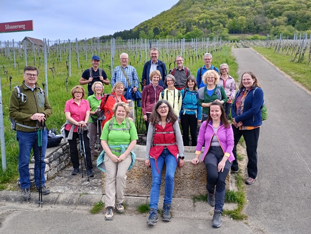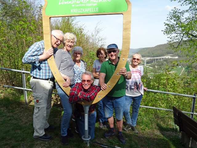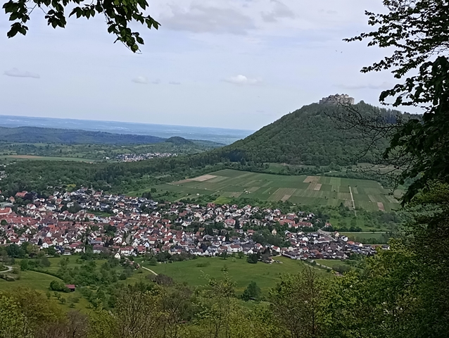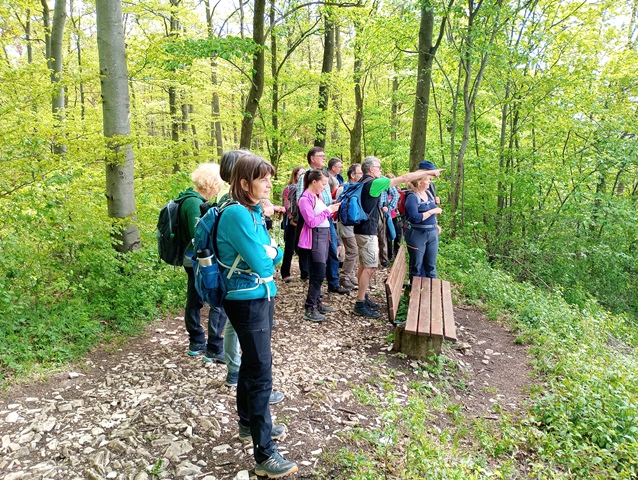 Zunächst ging es noch gemütlich durch die Weinberge, bevor der knackige Anstieg zum Schillingskreuz hoch folgte. Nach dieser Anstrengung mussten wir uns erst einmal eine kurze Rast mit leiblicher Stärkung gönnen. Auf dem Bergkamm zwischen Erms- und Neuffener Tal liefen wir durch den wunderbar ergrünten Buchenwald Richtung Dettinger Hörnle, das mit 707 Metern der höchste Punkt auf der Tour war. Auf dieser Strecke genossen wir immer wieder tolle Ausblicke rechter Hand auf die Burg Hohenneuffen sowie linker Hand bis nach Reutlingen. Angekommen auf dem Jusi, dem höchsten Schlot des vor 17 Millionen Jahren ausgebrochenen Schwäbischen Vulkans, waren wir von dem vor uns liegenden Panorama, das vom Stuttgarter Flughafen über Nürtingen bis zu unseren Drei-Kaiserbergen reichte, überwältigt. Nach einem alpinen Abstieg nach Kohlberg gingen wir gemütlich durch Streuobstwiesen zurück.