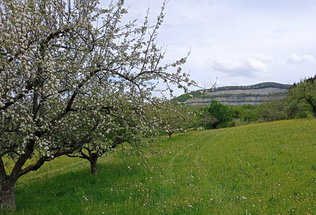 - Im Vordergrund blühende Obstbäume, im Hintergrund ein Steinbruch