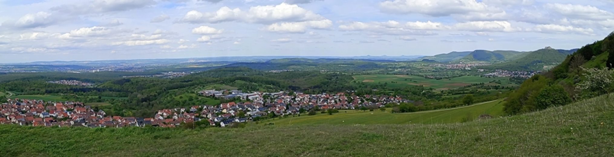 Zunächst ging es noch gemütlich durch die Weinberge, bevor der knackige Anstieg zum Schillingskreuz hoch folgte. Nach dieser Anstrengung mussten wir uns erst einmal eine kurze Rast mit leiblicher Stärkung gönnen. Auf dem Bergkamm zwischen Erms- und Neuffener Tal liefen wir durch den wunderbar ergrünten Buchenwald Richtung Dettinger Hörnle, das mit 707 Metern der höchste Punkt auf der Tour war. Auf dieser Strecke genossen wir immer wieder tolle Ausblicke rechter Hand auf die Burg Hohenneuffen sowie linker Hand bis nach Reutlingen. Angekommen auf dem Jusi, dem höchsten Schlot des vor 17 Millionen Jahren ausgebrochenen Schwäbischen Vulkans, waren wir von dem vor uns liegenden Panorama, das vom Stuttgarter Flughafen über Nürtingen bis zu unseren Drei-Kaiserbergen reichte, überwältigt. Nach einem alpinen Abstieg nach Kohlberg gingen wir gemütlich durch Streuobstwiesen zurück.