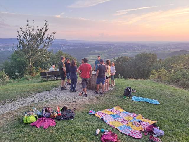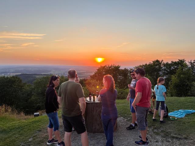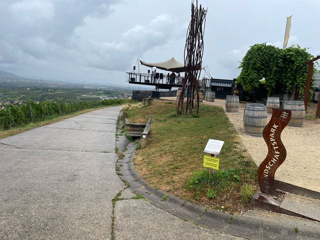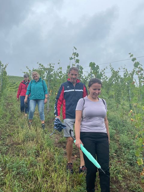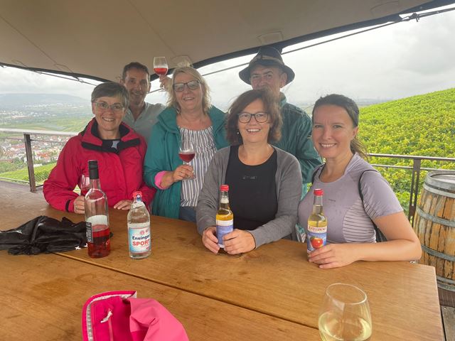 Der Weg ging dann zu den Weinbergen über, wo viele Trauben zu sehen waren. Das Ziel war die Luitenbacherhöhe. In letzter Minute konnten wir uns noch eine Flasche Wein und Wasser ergattern, bevor das Weingut Rühle aufgrund des Wetters Feierabend machte. Diese ließen wir uns jedoch genüsslich auf der Plattform schmecken.