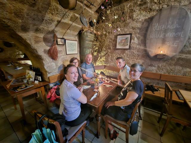 Rasch ging es dann zurück nach Großheppach mit toller Einkehr und leckerem Essen im sehr urigen „Weinkeller Schäfergässle“. Zum Abschluss gab es noch einen selbstgbrannten Schnaps von Walter.