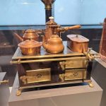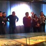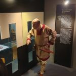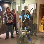 Holz konnten die Alamannen geschickt verarbeiten. So bewunderten wir eine reich verzierte Bauchflasche, aus der Bier getrunken wurde. Dann lauschten wir den Klängen eines Zupfinstrumentes. Das Gräberfeld des nahegelegenen Lauchheims lieferte die Grundlage für viele Fundstücke des Museums. Ob der ehemalige Friedhof noch öffentlich zugänglich sei, war die Frage. „Ja klar“, erklärte unser Alamanne: „Da können sie gerne hingehen: das ist heute ein Industriegebiet. Zu sehen gibt es dort aber leider nichts mehr.“ Diesem Industriegebiet ist es zu verdanken, dass die Grabstätten entdeckt worden waren. Denn beim Ausbaggern entdeckte der Baggerfahrer Goldblattkreuze. Die Grabbeilagen waren beeindruckend und aufschlussreich. Die Damenwelt konnte sich durchaus identifizieren mit einer Kombi aus indigoblauem Stoff gehüllt in Maulbeerseide, kombiniert mit wunderschönem Schmuck.