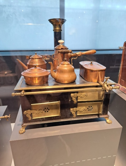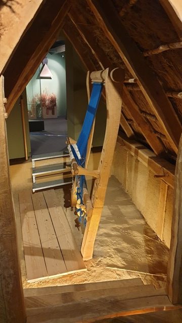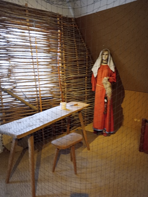 Wir betraten zunächst eine Webhütte, die tief in den Boden eingelassen war. Wir erfuhren, wie diese rekonstruiert worden war. Zum Essen gab es damals Getreide und Hülsenfrüchte. Das Fleisch der Kuh musste lange gekocht werden, denn die Kuh wurde erst geschlachtet, nachdem sie viele Jahre den Karren gezogen, jährlich ein Kälbchen zur Welt gebracht und Milch gegeben hatte.