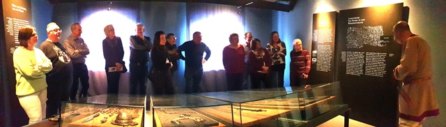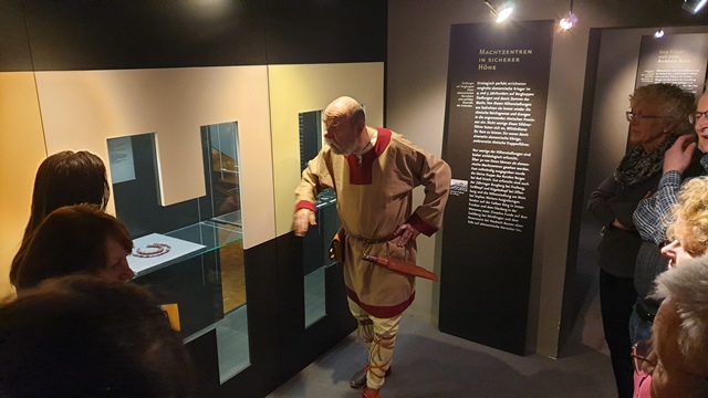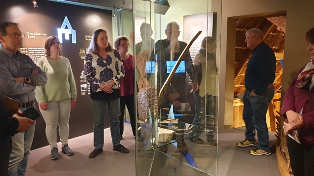 Holz konnten die Alamannen geschickt verarbeiten. So bewunderten wir eine reich verzierte Bauchflasche, aus der Bier getrunken wurde. Dann lauschten wir den Klängen eines Zupfinstrumentes. Das Gräberfeld des nahegelegenen Lauchheims lieferte die Grundlage für viele Fundstücke des Museums. Ob der ehemalige Friedhof noch öffentlich zugänglich sei, war die Frage. „Ja klar“, erklärte unser Alamanne: „Da können sie gerne hingehen: das ist heute ein Industriegebiet. Zu sehen gibt es dort aber leider nichts mehr.“ Diesem Industriegebiet ist es zu verdanken, dass die Grabstätten entdeckt worden waren. Denn beim Ausbaggern entdeckte der Baggerfahrer Goldblattkreuze. Die Grabbeilagen waren beeindruckend und aufschlussreich. Die Damenwelt konnte sich durchaus identifizieren mit einer Kombi aus indigoblauem Stoff gehüllt in Maulbeerseide, kombiniert mit wunderschönem Schmuck.