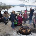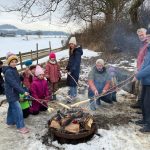 Am Sonntag, den 01.02.2026, blieb es trocken von oben herab und so machten sich die jungen Familien vom Schulparkplatz aus auf, zum Waldspielplatz hinaus zu wandern. Unterwegs gesellten sich noch weitere hinzu, so dass es schließlich neun Familien waren, deren Kids sich sofort den Spielgeräten oder dem schon entzündeten Lagerfeuer widmeten. Das trockene Holz prasselte verlockend im Steinrund, den Kindern macht es super Spaß, darin herumzustochern und warm ist es auch noch am Feuer. Der Kinderpunsch aus Warmhaltekannen und der vorbereitete Stockbrotteig tat ein Übriges, um dann nahezu alle Kinder rund ums Feuer zu versammeln. Die Eltern durften den selbstgemachten Glühwein aus Eisele-Produktion genießen und so entwickelten sich viele Gespräche um die Kids und um das Programm der Jungen Familien in 2026, was gerade erst los ging. Von der demnächst anstehenden Märzenbecherwanderung über den Erlebnistag auf dem Flugplatz Hornberg, bis hin zur Beerenaktion zusammen mit dem OGV und schließlich auch zur mittlerweile schon 46. Waldweihnacht im Dezember wird einiges geboten. Gäste sind jederzeit herzlich willkommen. Der Stockbrotteig ging dann langsam zur Neige, wobei die mitgebrachte Schokocreme erstaunlicherweise noch nicht leer war. Und auch die Kälte drang allmählich unter die Jacken und Mäntel. Ein gelungener Nachmittag ging zu Ende. Vielen Dank an Familie Eisele für Holz, Punsch und Glühwein und die ausgezeichnete Vorbereitung.