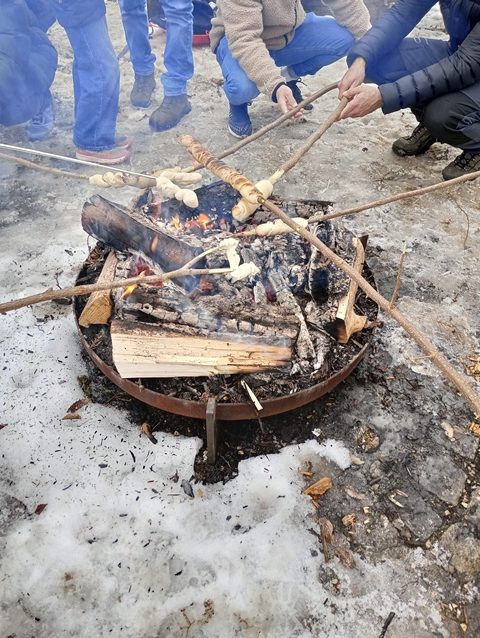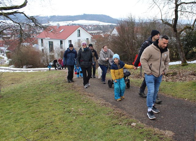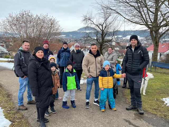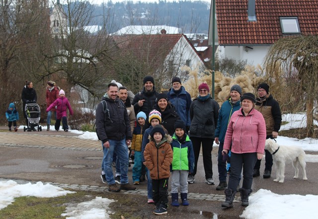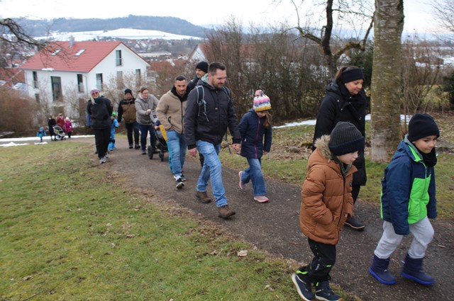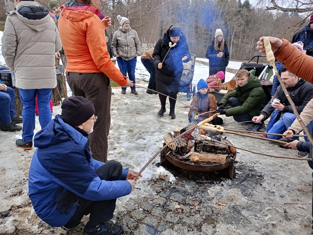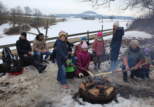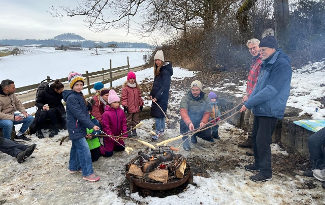 Am Sonntag, den 01.02.2026, blieb es trocken von oben herab und so machten sich die jungen Familien vom Schulparkplatz aus auf, zum Waldspielplatz hinaus zu wandern. Unterwegs gesellten sich noch weitere hinzu, so dass es schließlich neun Familien waren, deren Kids sich sofort den Spielgeräten oder dem schon entzündeten Lagerfeuer widmeten. Das trockene Holz prasselte verlockend im Steinrund, den Kindern macht es super Spaß, darin herumzustochern und warm ist es auch noch am Feuer. Der Kinderpunsch aus Warmhaltekannen und der vorbereitete Stockbrotteig tat ein Übriges, um dann nahezu alle Kinder rund ums Feuer zu versammeln. Die Eltern durften den selbstgemachten Glühwein aus Eisele-Produktion genießen und so entwickelten sich viele Gespräche um die Kids und um das Programm der Jungen Familien in 2026, was gerade erst los ging. Von der demnächst anstehenden Märzenbecherwanderung über den Erlebnistag auf dem Flugplatz Hornberg, bis hin zur Beerenaktion zusammen mit dem OGV und schließlich auch zur mittlerweile schon 46. Waldweihnacht im Dezember wird einiges geboten. Gäste sind jederzeit herzlich willkommen. Der Stockbrotteig ging dann langsam zur Neige, wobei die mitgebrachte Schokocreme erstaunlicherweise noch nicht leer war. Und auch die Kälte drang allmählich unter die Jacken und Mäntel. Ein gelungener Nachmittag ging zu Ende. Vielen Dank an Familie Eisele für Holz, Punsch und Glühwein und die ausgezeichnete Vorbereitung.