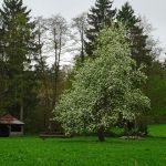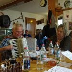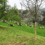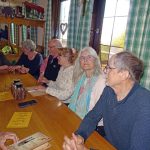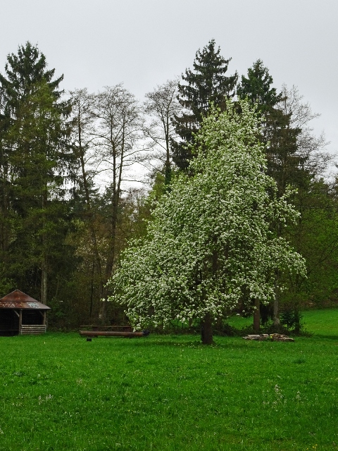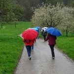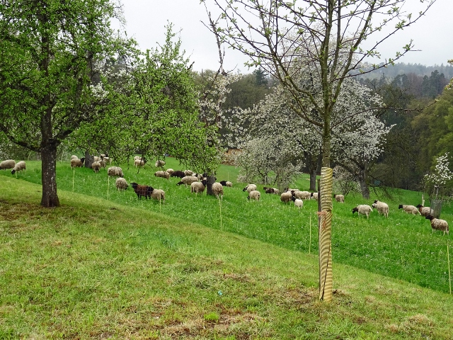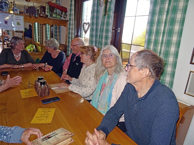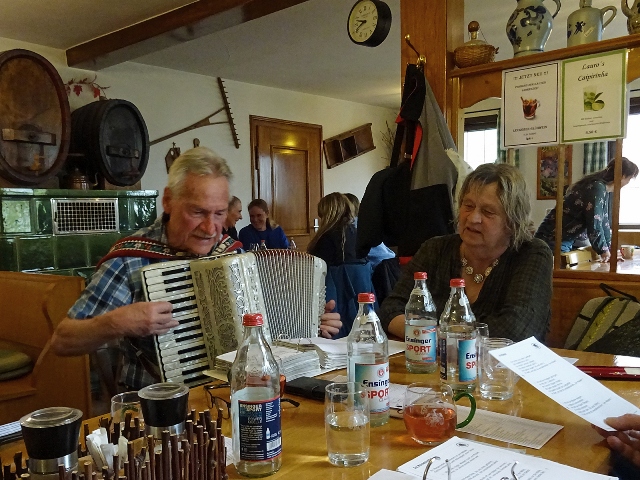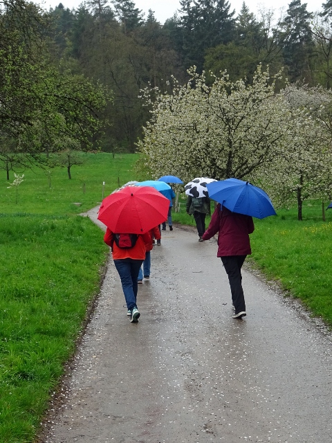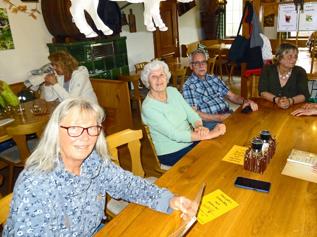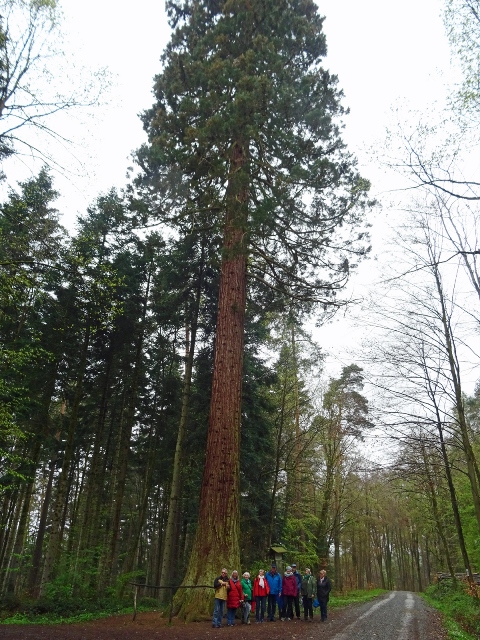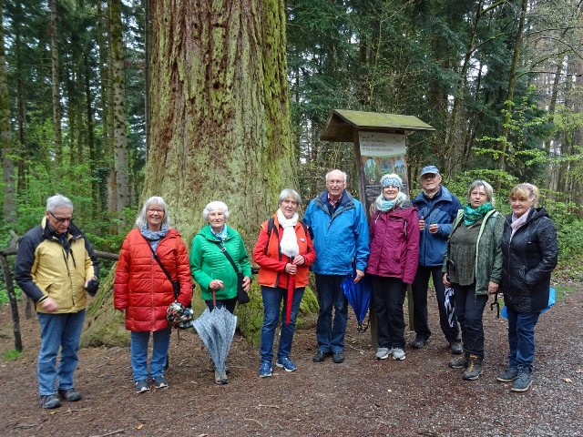 Hinaus aus dem kleinen Ort und schon wurden wir von einer kleinen Schafherde auf der Weide begrüßt. Kirschbäume, Apfelbäume und sogar schon Birnbäume standen kurz vor der Blüte oder blühten schon. Die Wanderung, sie folgte dem Jubiläumsweg zum 100jährigen Bestehen der Ortsgruppe Schorndorf, führte uns schon bald in einen lichten Mischwald. Es ging nur leicht aufwärts und am Weg stand eine ganze Gruppe Mammutbäume. Ihre Größe sowie die besonders dicke Rinde sind immer wieder beeindruckend. Von nun an ging es immer leicht bergab, was wir sehr genossen. Eine Ahnung ging vielen durch den Kopf (das müssen wir später wieder hinauf!!!). Zuerst aber erreichten wir den im Volksmund so genannten „Königsstein“. Er wurde anno 1846 zur Hochzeit des Kronprinzenpaares Karl von Württemberg und Olga, Großfürstin von Russland errichtet. Eine kurze Pause, es gab etwas „Geistiges“ für den Leib und es kam wie es kommen musste: nun ging es aufwärts. Etwas gemütlicher, eben seniorengerecht, erreichten wir wieder die Hochfläche. Die Vorfreude auf unser Ziel, die Besengaststätte vom Weingut Thön, ließ das letzte Teilstück wie im Flug vorbeigehen. Also machten wir Einkehr in der sehr gemütlichen Lokalität. Schnell waren die Getränke bestellt und auch zum Essen war für jede und jeden etwas dabei. Allen hat es sehr gut geschmeckt und dann wurde unser Gerhard noch zum Musizieren überredet. Obwohl wir nur eine kleine Gruppe waren, klappte es mit dem Singen sehr gut. Besten Dank unseren Organisatoren Christa und Günther und natürlich auch unserem Gerhard, sowie allen, die dabei waren.