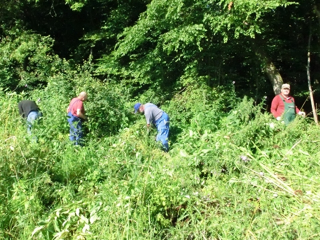Am letzten Samstag zogen zehn wackere Mannen aus gegen das Indische Springkraut. Diese invasive Pflanze verdrängt durch ihr enormes Wachstum und die große Samenzahl die einheimischen Pflanzen. Im Wald südlich vom Ort gibt es zahlreiche Stellen, wo es sich flächenartig ausbreitet. Dort waren Männer des Obst- und Gartenbauvereins und aus unserer Ortsgruppe unterwegs um dieses einjährige Kraut auszureißen oder abzumähen. Noch blüht es zwar nur ganz vereinzelt, aber an Blattform und Stengel kann man es gut erkennen. Drei Stunden wurde intensiv gearbeitet und einige Stellen vollkommen gereinigt. Voraussichtlich Ende Juli werden wir erneut tätig werden. Wer sich gerne beteiligen möchte, kann sich gerne bei mir melden. Den Männern vom Samstag gilt schon mal mein Dank für diese nachhaltige Aktion zur Erhaltung der heimischen Artenvielfalt.