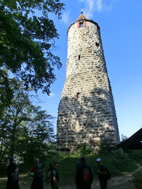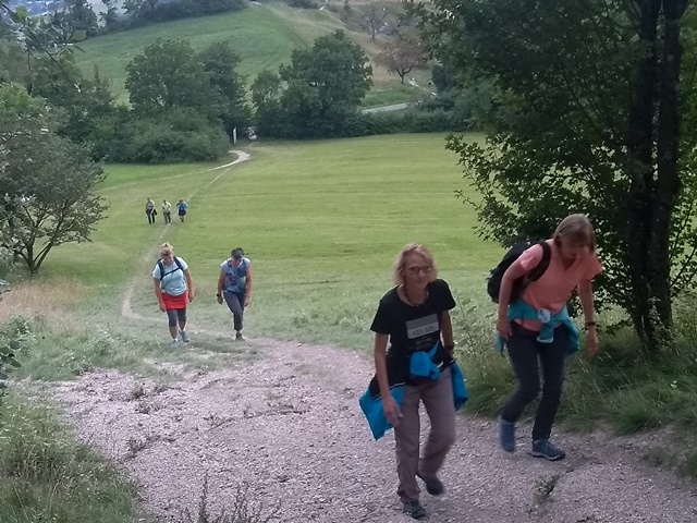 Gegen 18.30 Uhr starteten wir weiter Richtung Heimat, aber irgendwie hatten wir doch noch so viel Power in den Beinen, dass wir spontan auch noch auf den Hohenstaufen wanderten, um dort einen „Sundowner“ zu uns zu nehmen. War das schön! Allerdings konnte man von dort oben auch herrlich beobachten, wie der Regenvorhang langsam näher kam. Unser auf Wetterbeobachtung spezialisierter Mitwanderer versicherte zwar glaubhaft, dass wir trocken davonkommen würden – knapp daneben. Auf dem Heimweg nach Wäschenbeuren gab es doch noch eine leichte, aber warme Dusche von oben, was der ohnehin schon sehr guten Stimmung keinen Abbruch tat.