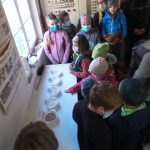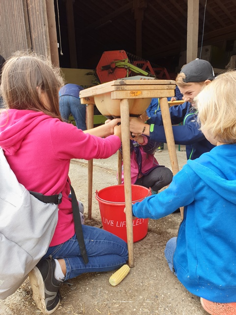 So erfuhren die Kinder, welche Lebensmittel man alle aus den verschiedenen Getreidearten, die auf dem Hof angebaut werden, gewinnen kann. Brot, Kuchen, Nudeln, Cornflakes, Popcorn, Bier und vieles andere mehr. Und dass man zunächst den Boden pflügen und eggen muss, dann die Samen säen und die Pflanzen düngen muss, um überhaupt eine Ernte einfahren zu können, war schon für viele neu.