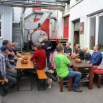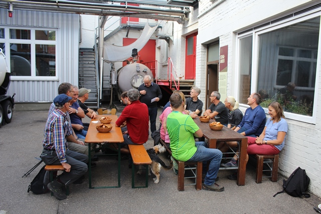Warum in die Ferne ….., wenn es gutes Bier auch in der Nähe gibt. Nach diesem Motto verfuhren Susanne und Rainer Kühner bei unserer mittlerweile 11. Brauereiwanderung. Mit Bus und Bahn ging es nach Geislingen, wo gleich der schweißtreibende Anstieg zur Burg Helfenstein in Angriff genommen wurde. Bei schönstem Wanderwetter war daher auch die Aussicht auf die Fünftälerstadt grandios. Durch den schattigen Wald über der Stadt führte der Weg zunächst hinüber zum Ödeturm und dann weiter dem Löwenpfad Steigentour folgend zum Mühltalfelsen oberhalb der Straubschen Mühle mit Blick auf die Bahngleise der Geislinger Steige. Die Mittagseinkehr erfolgte in der Ziegelhütte, einer Vesperwirtschaft gleich neben der B10. Dort gibt es Limburger in Essig mit Zwiebeln, Saure Kutteln, Sülze oder auch einfach ein Paar Saiten. Die Hühner des angrenzenden Hofes laufen dabei zwischen den Beinen herum, wachsam beäugt vom stolzen Hahn. Frisch gestärkt ging es nun bergab ins Rohrachtal und nach einer Kaffeepause bei Straub erreichten die siebzehn Wanderer schließlich die Kaiser-Brauerei mitten in Geislingen. Im Brauereishop konnten erstmal „kaiserliche“ Erinnerungsstücke erworben werden, bevor uns dann Seniorchef Hans-Friedrich Kumpf im Hof der Brauerei die Geschichte des Betriebes und die aktuelle, sehr erfolgreiche Neuausrichtung näher erläuterte. Dazu durfte eine köstliche Bierprobe nicht fehlen. Das beim „World Beer Award“ als bestes deutsches Helles prämierte neue Mitglied der Kaiser-Bierfamilie machte den Anfang. Export, Naturpils, Kellerpils und das helle Hefeweizen folgten nach, bis der Koch des nahen Bräustübles zum Aufbruch mahnte. Dort konnten sich erstaunlicherweise noch alle an die vorbestellten Speisen erinnern und labten sich an deftigem Bier-, Sauer oder Rehbraten, an Maultaschen, Schnitzel oder Zanderfilets. Das gab wieder Kraft für den kurzen Marsch durch die Geislinger Fußgängerzone zum Bahnhof. Als letzter Akt des gelungenen Ausflugs mussten am Rathausbrunnen in Wäschenbeuren noch die letzten, überlebenden „Unterwegs-Biere“ getrunken werden. Herzlichens Dankeschön an Kühners, es hat großen Spaß gemacht.