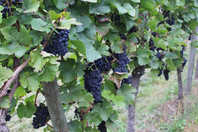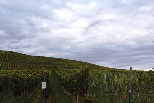 Zwischen zwei Varianten konnte je nach Belieben ausgewählt werden. Für alle die nicht so gut zu Fuß sind: Eine Stunde Erkundung des Weinbergs und Trauben naschen, dann Fahrt mit dem Bus zum Weingut Birkert in Adolzfurt.