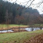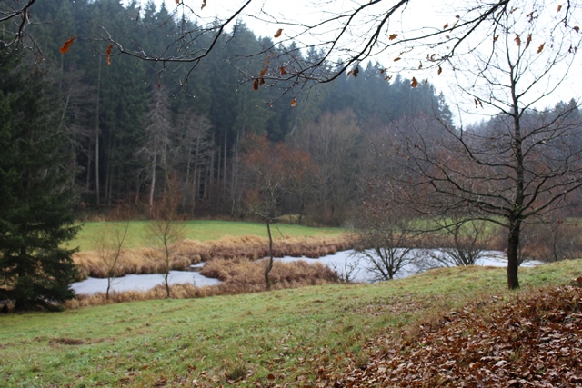 Nachdem der Weihnachtsmarkt in Gmünd doch noch abgesagt wurde, starteten die sechs Mitwanderer am vergangenen Sonntag erst um 13 Uhr am Schulhausparkplatz. Nach kurzer Fahrt über Gmünd und Lindach parkten wir die Fahrzeuge an der Täferroter Kirche. Eine kurze Strecke legten wir innerorts (die Gemeinde hat gerade 1.000 Bewohner und ist daher überschaubar) zurück und wanderten dann entlang des romantischen Leintals. Wir passierten kurz nach Ortsende das 1964 erbaute Rückhaltebecken Täferrot. Kaum zu glauben, dass dies einmal gefüllt sein könnte; was für Regengüsse müssen da niedergehen. Weiter führte uns der Weg entlang der mäandernden Lein, die teils sogar leicht zugefroren war. In diesem Tal stand bis zum Bau des Rückhaltenbeckens auch eine Mühle mit Gasthaus, und im 16. Jahrhundert wurde dort im Leintal auf Durlanger Gemarkung sogar etwas Bergbau betrieben. Anschließend überquerten wir die Lein und stiegen steil zur Hochfläche, der sogenannten Liashöhe, auf. Wir bewegten uns nun wieder ostwärts Richtung Lindach, ließen den Ort rechterhand liegen und passierten den Lindacher Wasserturm. Leichte Schneeflocken begleiteten uns auf dem rund 5 km langen Höhenweg bis zum kurzen Abstieg nach Täferrot. Der gut zweistündigen Wanderung schloss sich eine Einkehr in der gemütlichen (und empfehlenswerten) Gaststätte „Leintalperle“ in Täferrot an, wo wir noch Schnitzel, Wurst- und Ochsenmaulsalat und Nürnberger Tucherbräu genießen durften.