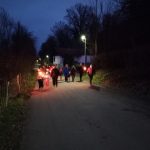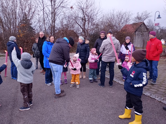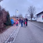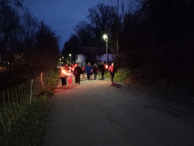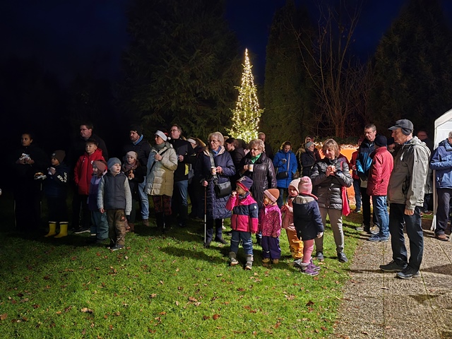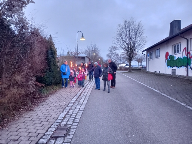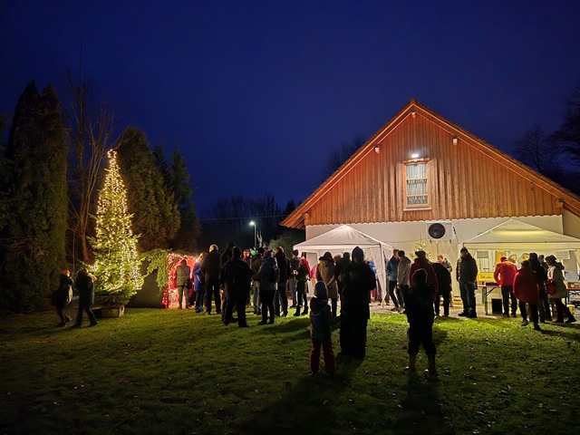 Traditionen werden hochgehalten beim Albverein und somit stand am 14. Dezember die 45. Waldweihnacht an. An die Kinder wurden am Treffpunkt TSV-Parkplatz die Fackeln ausgeteilt und schon wanderten alle los in die beginnende Dunkelheit hinein runter zum Gaißrein. Am Sängerheim stand ein großer, beleuchteter Weihnachtsbaum, war die wunderschöne Krippe mit Jesuskind, Maria und Josef aufgebaut und der Stand mit Kinderpunsch, Glühwein und warmen Brezeln war natürlich auch da.