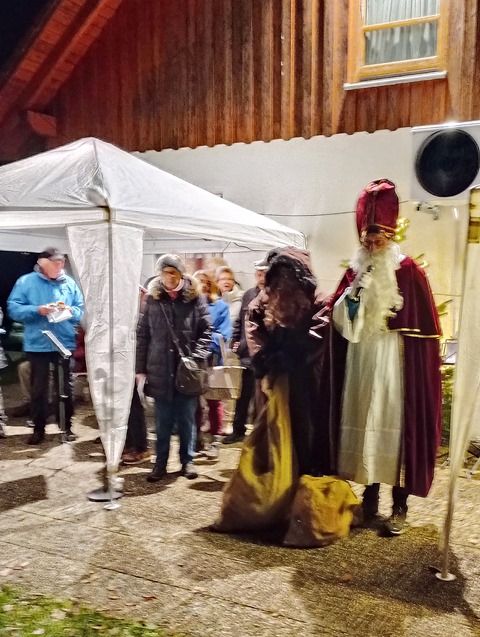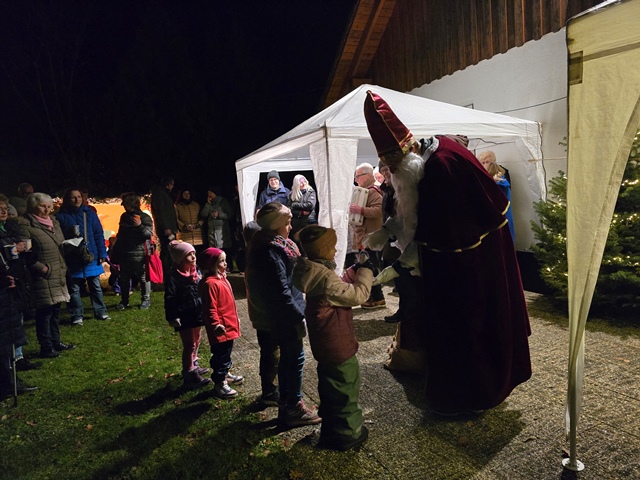 Die Flötengruppe von Melanie Knödler, die Bläser und die Singgruppe des Albvereins präsentierten die schönsten Weihnachtslieder und nach dem erneut gemeinsamen Lied „Lasst uns froh und munter sein“ trafen dann auch der Heilige Nikolaus und sein Begleiter Knecht Ruprecht ein. Aus dem prall gefüllten Sack erhielten alle Kinder ein Geschenk. Es macht so viel Freude, den Kindern bei vorgetragenen Gedichten oder Liedern zuzuhören. Nach dem Schlusswort stand man noch gemütlich zusammen, genoss den guten Glühwein und wünschte sich schließlich gegenseitig frohe Weihnacht.